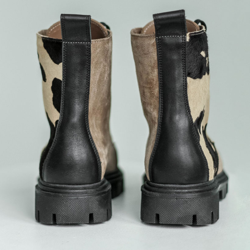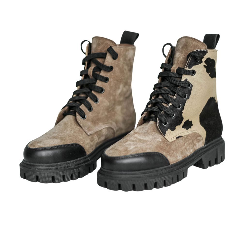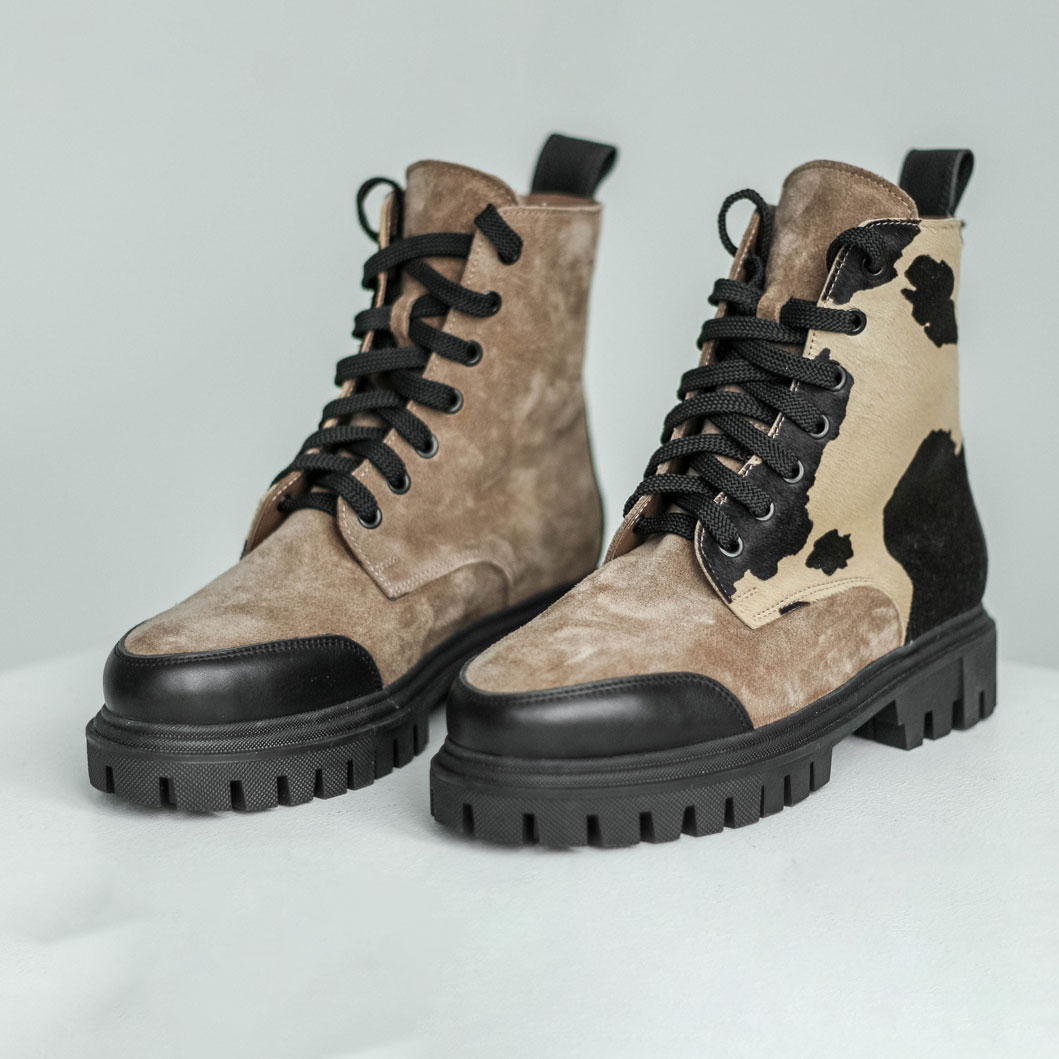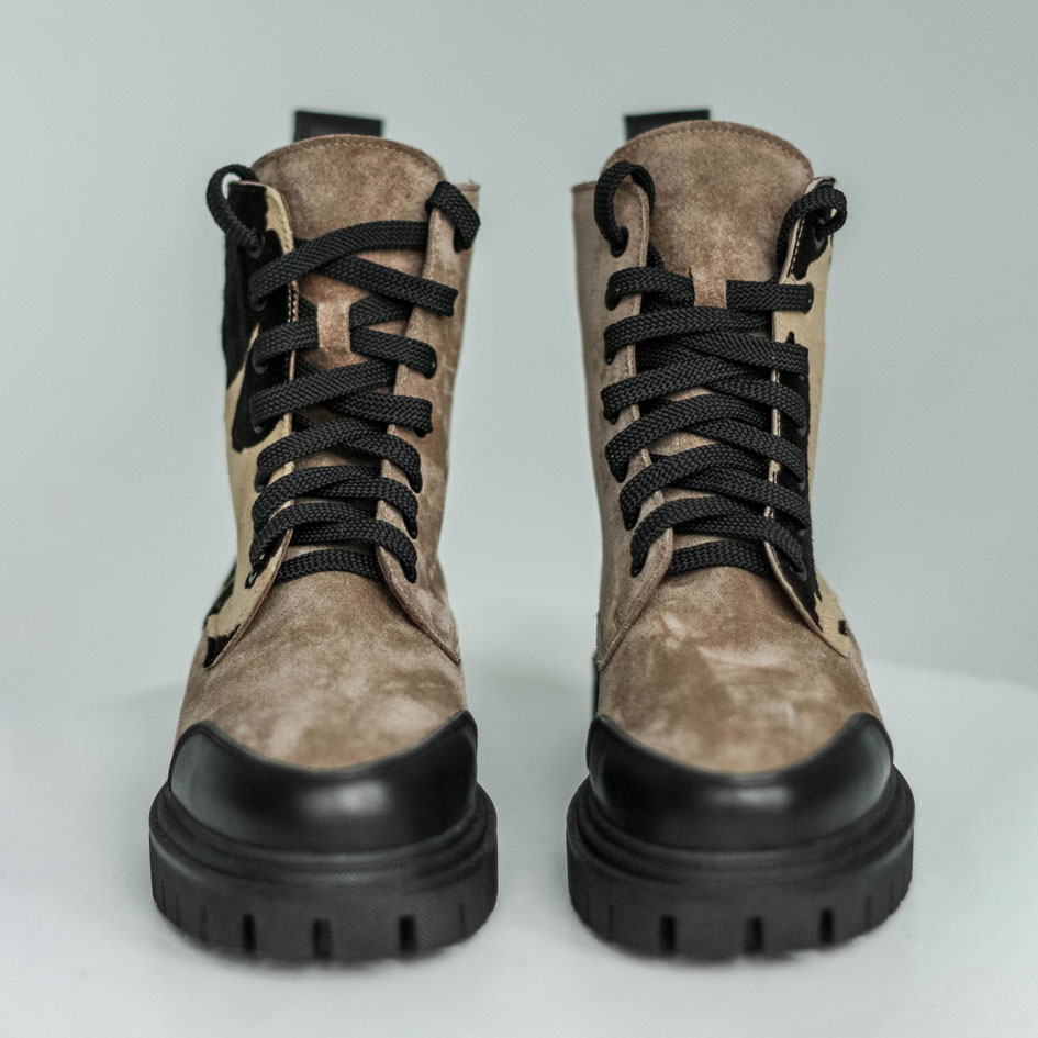 Замшевые ботинки в мягком бежевом оттенке с принтом - акцентная пара на каждый день. Материалы: 100% натуральная замша. Подклад на выбор - кожа, байка или мех. Температурный режим: кожа - до −5 °C, байка - до −20 °C, мех - до −30 °C. Параметры изделия: Высота подошвы (борт):см