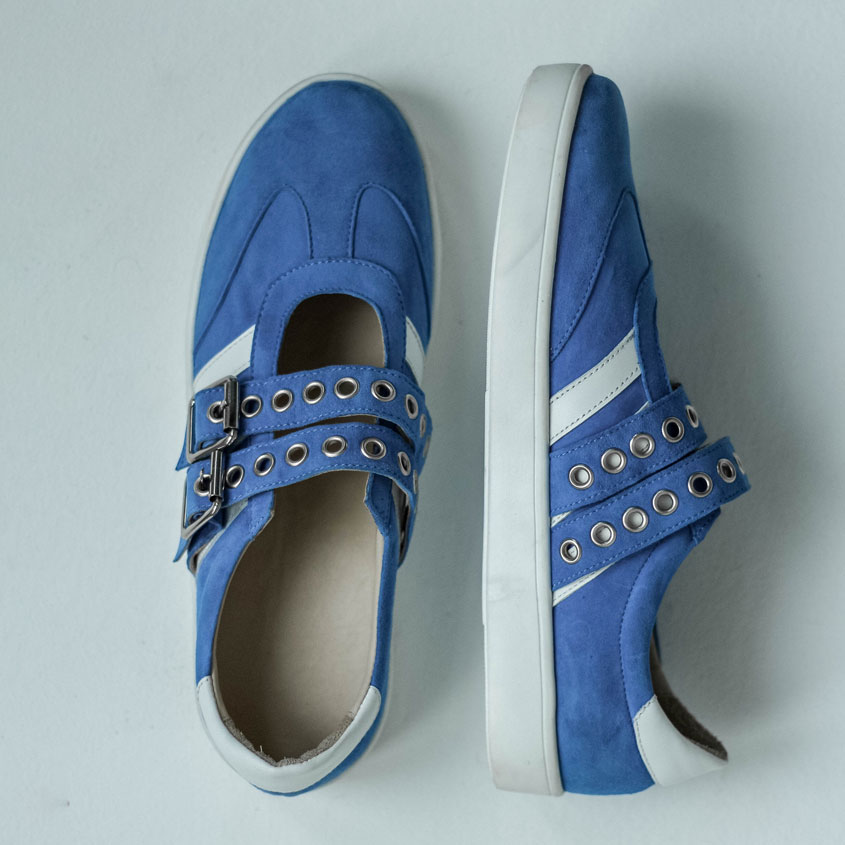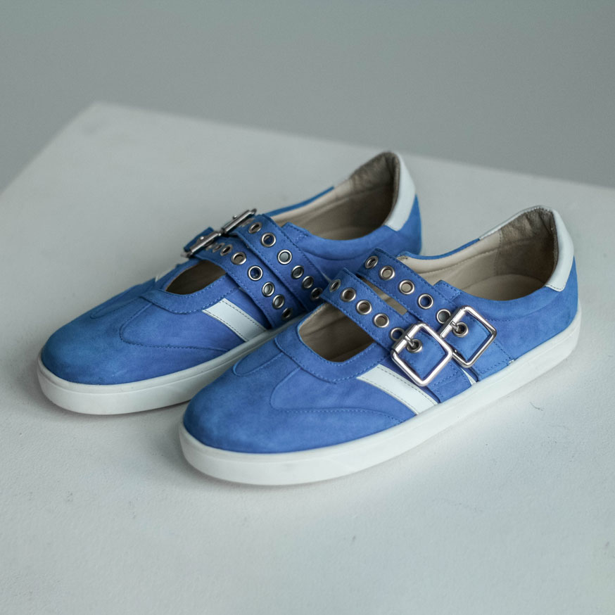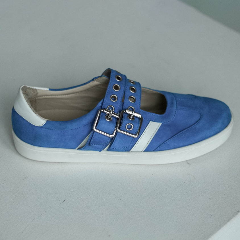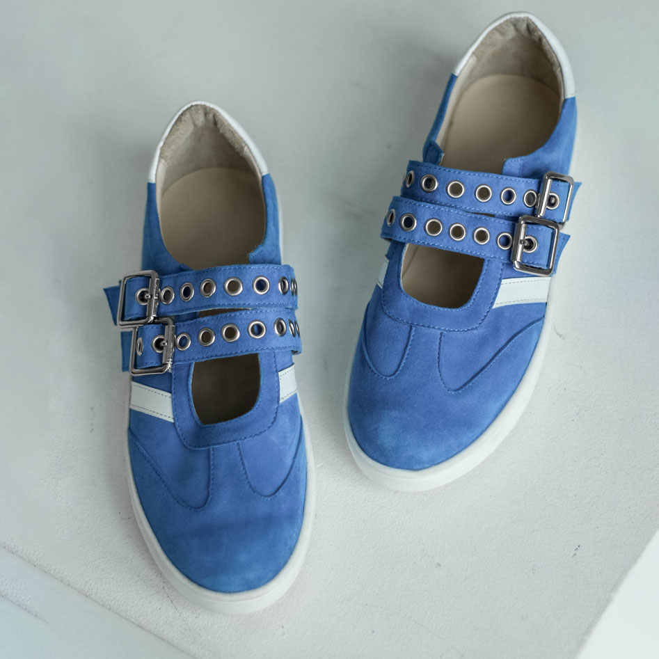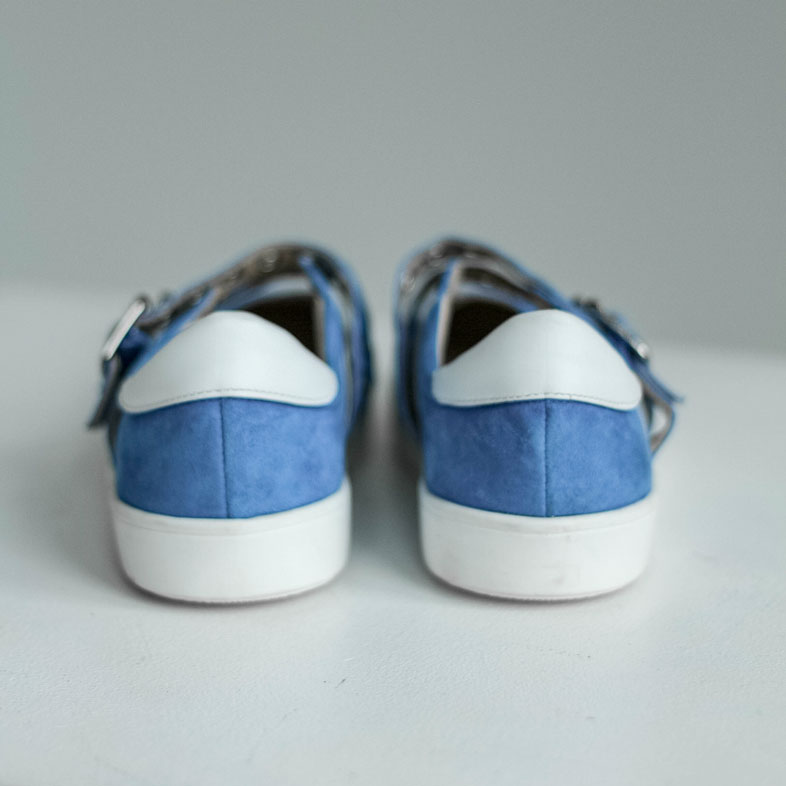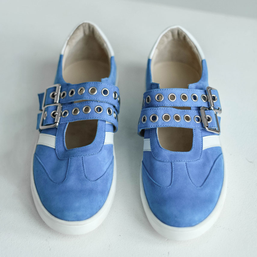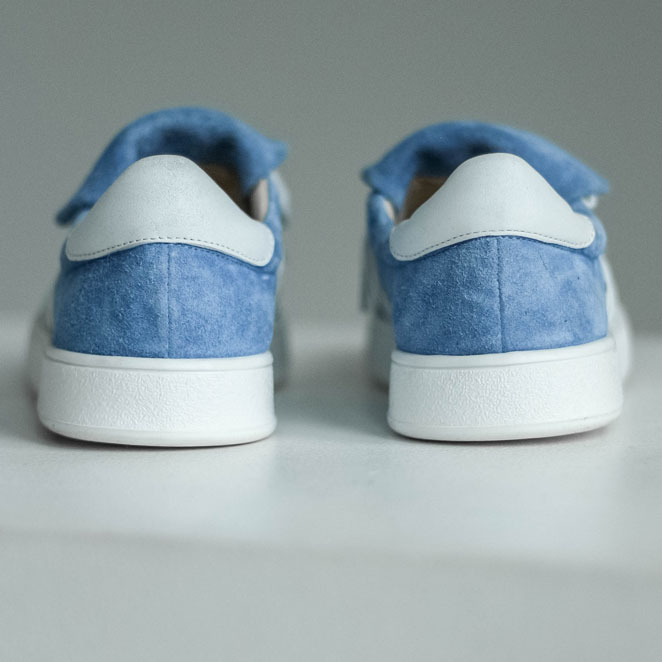Кеды сандалии замшевые голубые с ремешками и белыми лампасами. Материалы: 100% натуральная замша. Подклад на выбор - кожа, байка или мех. Температурный режим: кожа - до −5 °C, байка - до −20 °C, мех - до −30 °C. Параметры изделия: Высота подошвы (борт):2,5 см