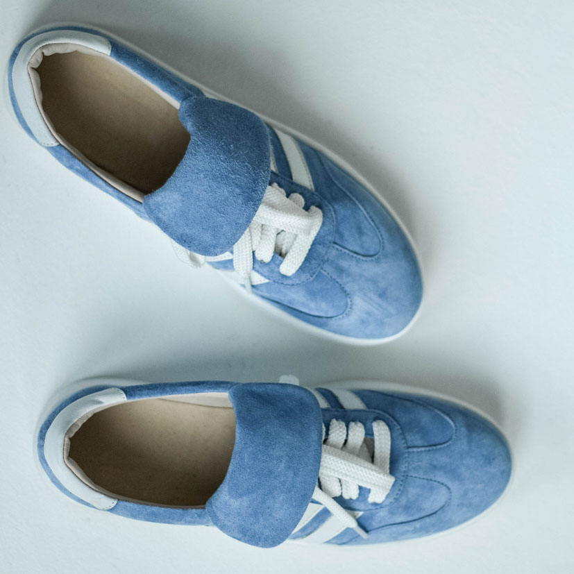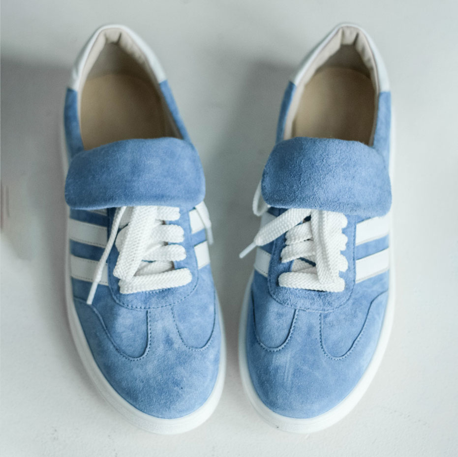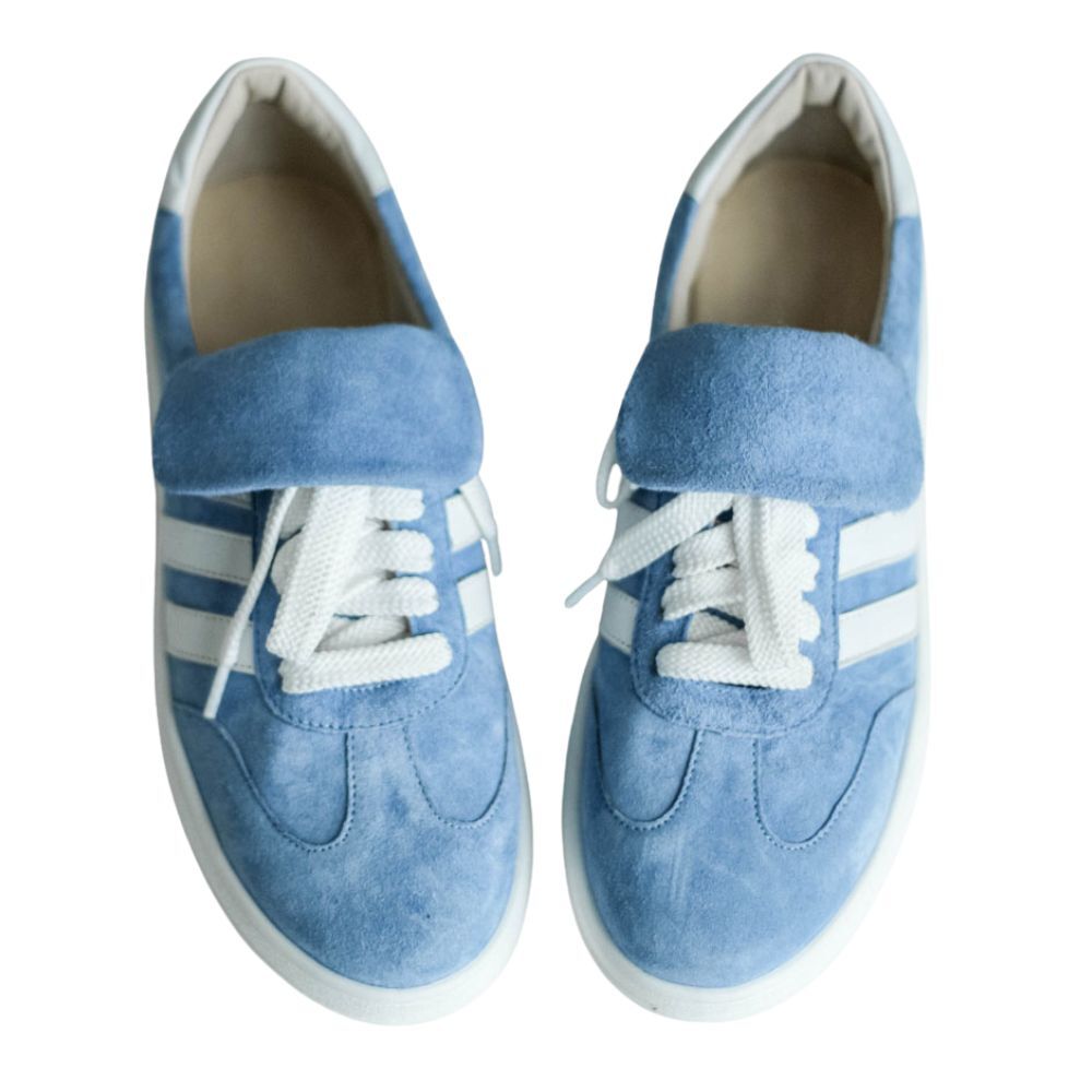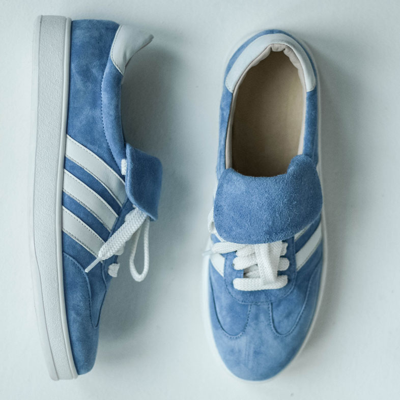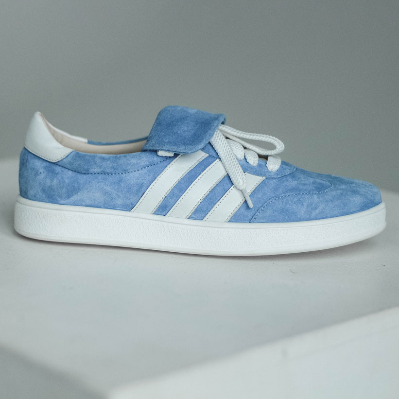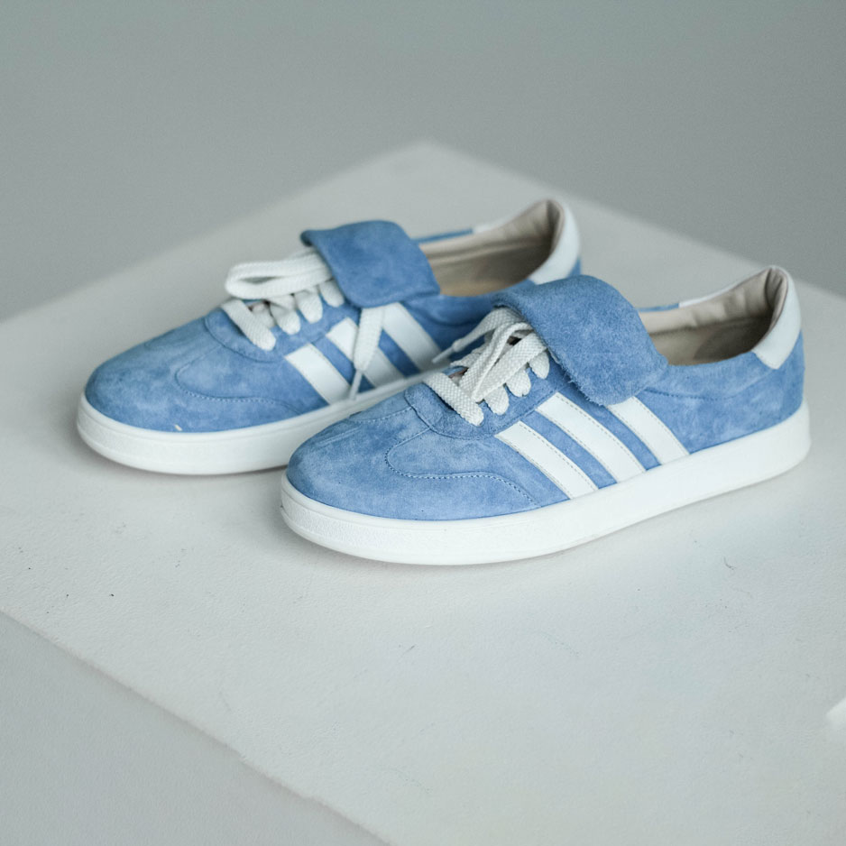 Кеды замшевые голубые с белым, самба. Кеды выполнены из мягкой замши в нежном небесно-голубом оттенке c белыми кожаными лампасами .