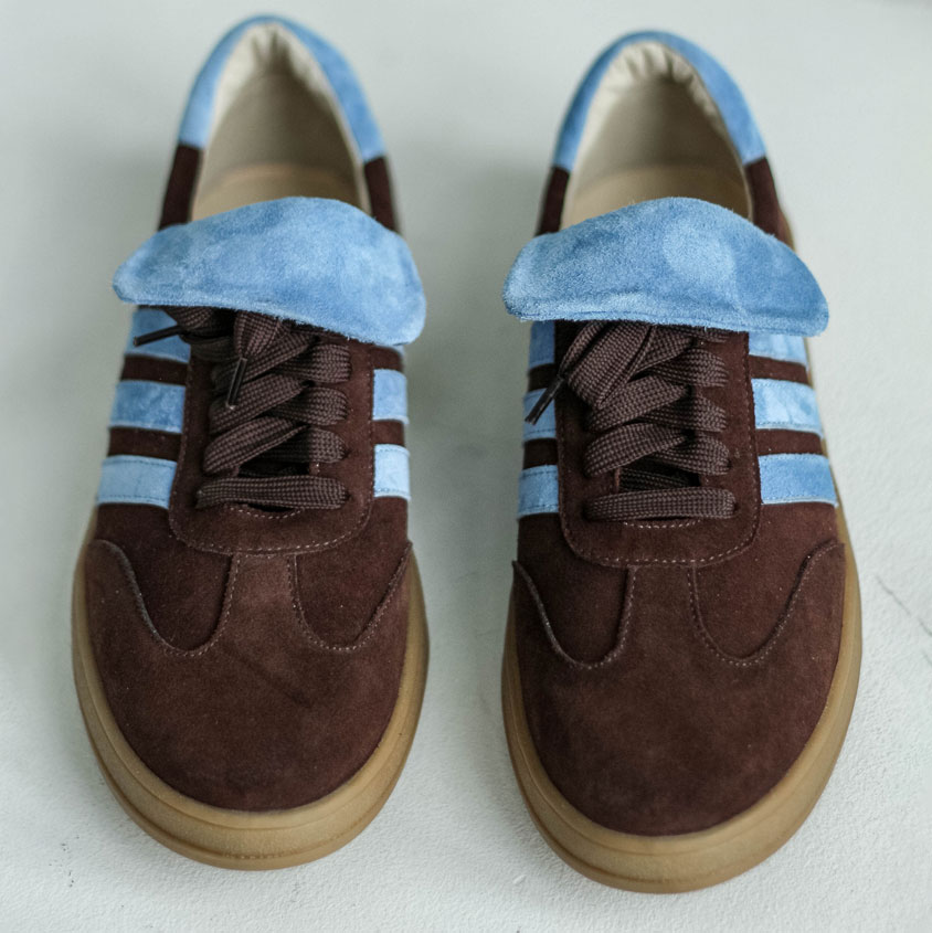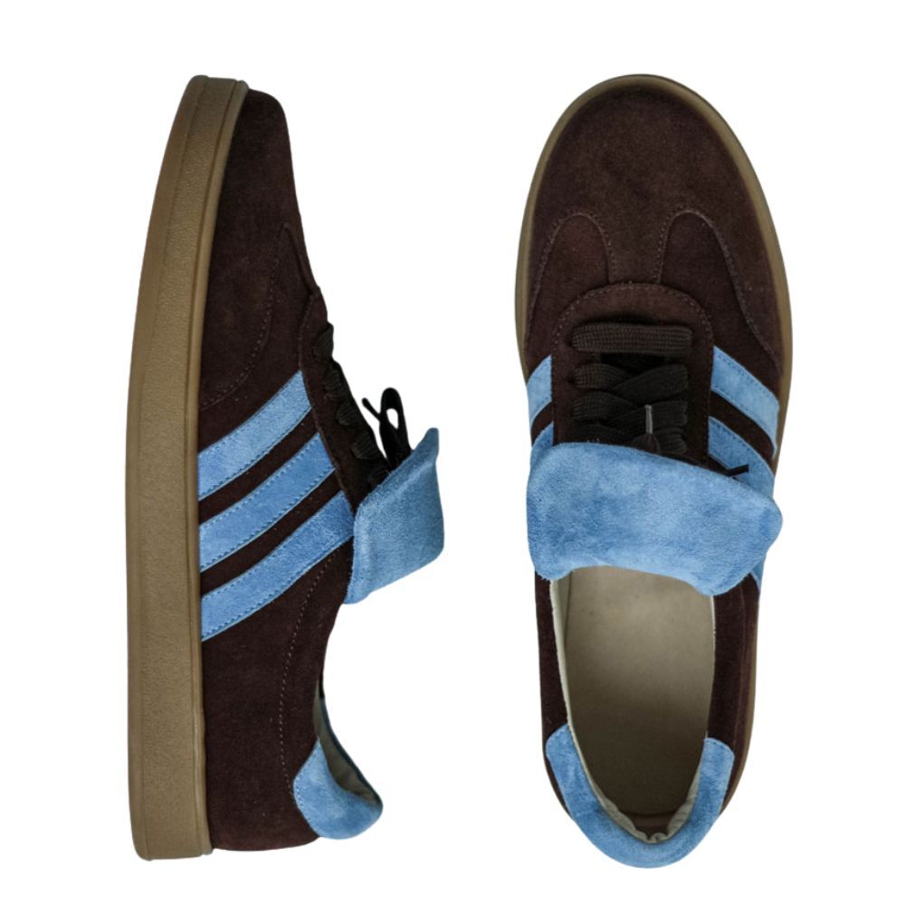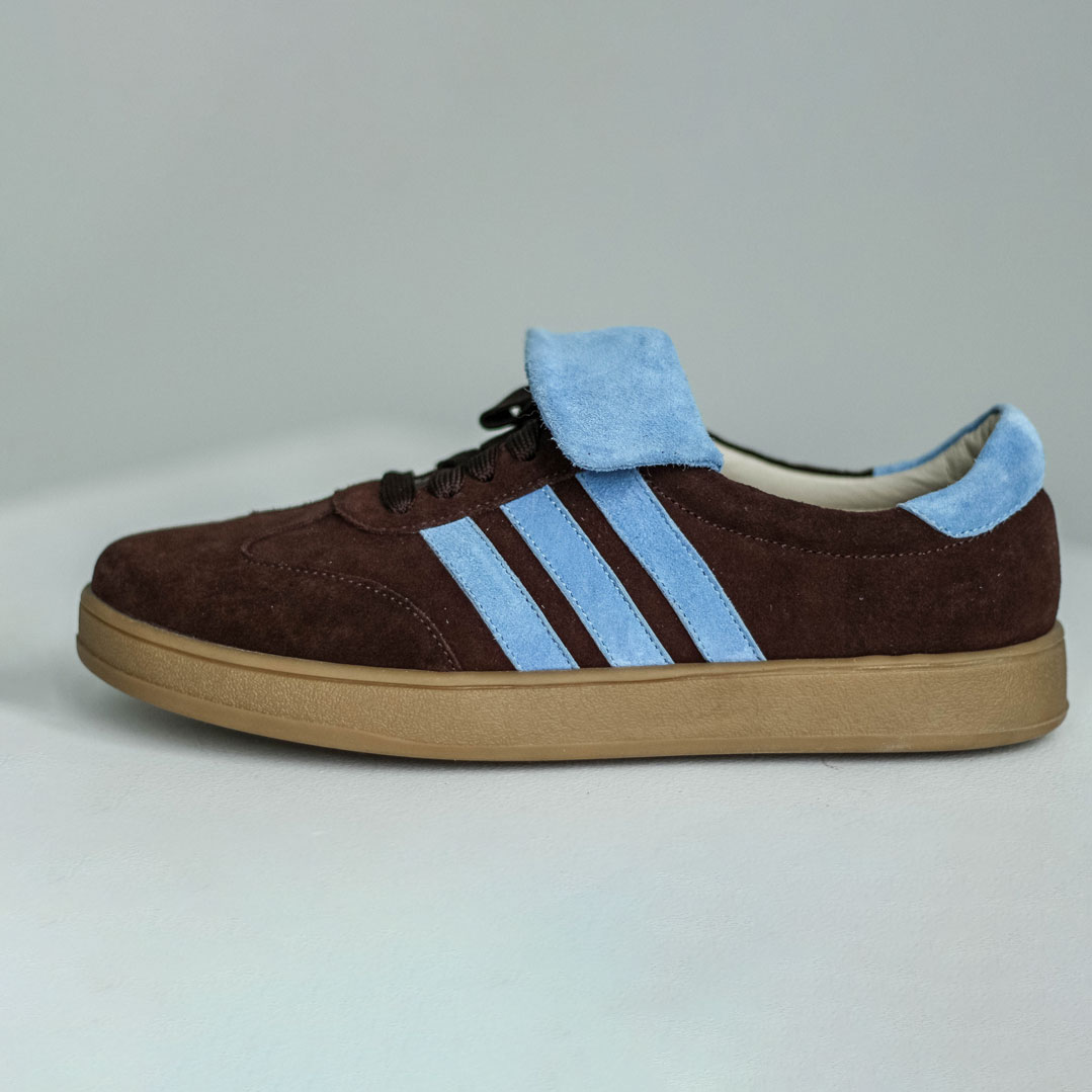 Кеды замшевые темный шоколад с голубым ,самба Кеды выполнены из мягкой замши в трендовом шоколадном оттенке с контрастными голубыми элементами.