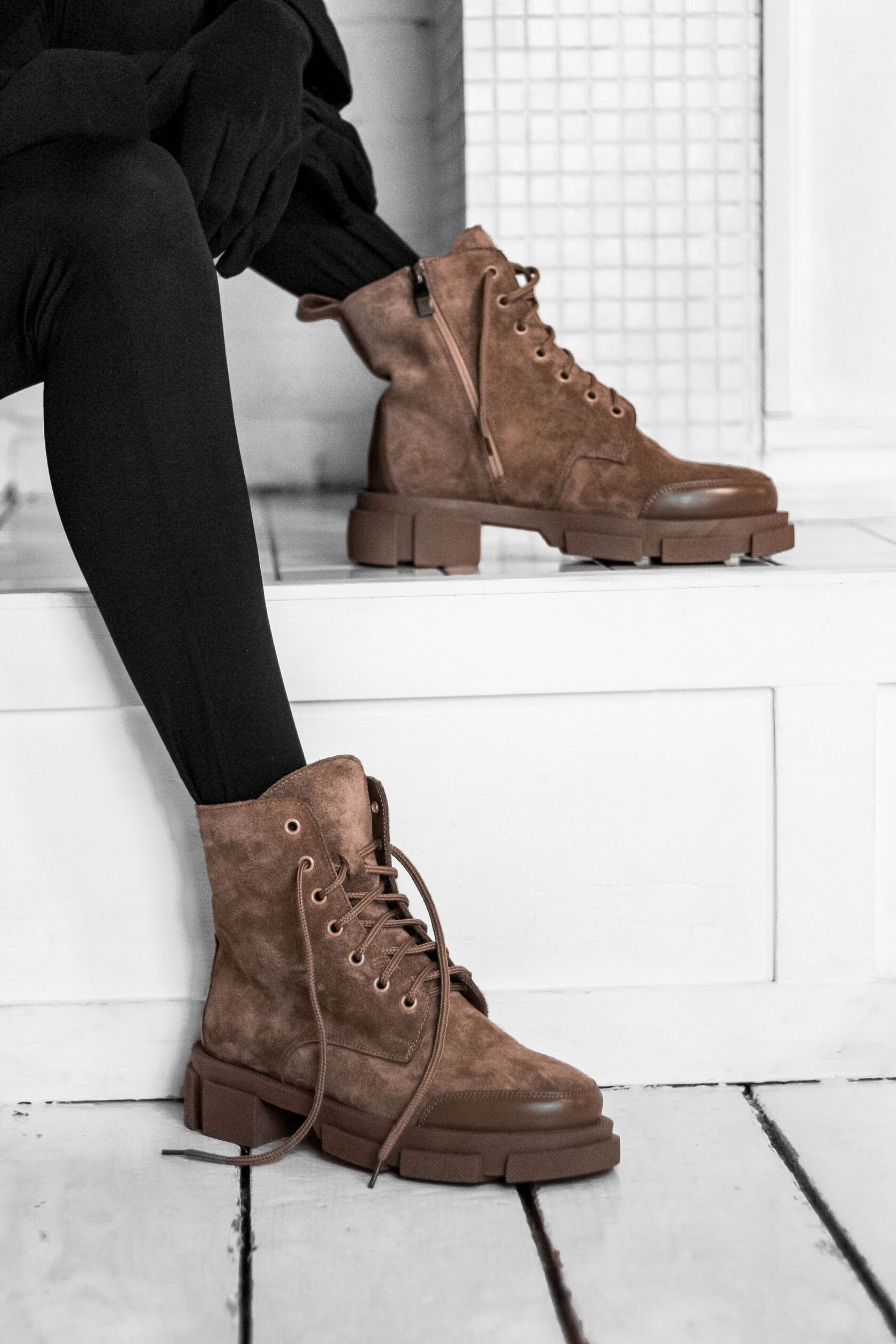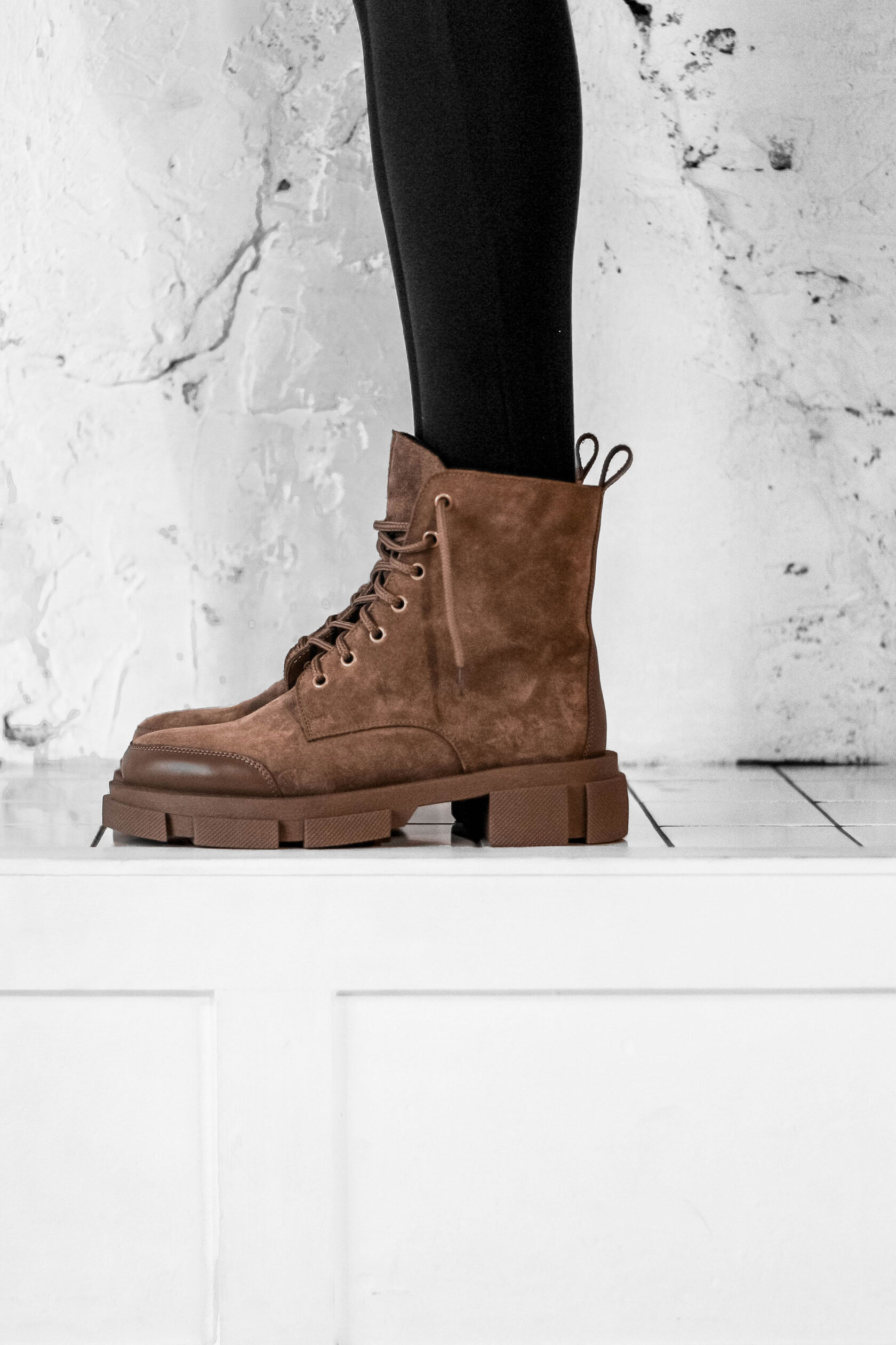 Материалы: 100% натуральная замша + натуральная кожа. Подклад на выбор - кожа, байка или мех. Температурный режим: кожа - до −5 °C, байка - до −20 °C, мех - до −30 °C. Параметры изделия: Высота подошвы (борт):2,5 см